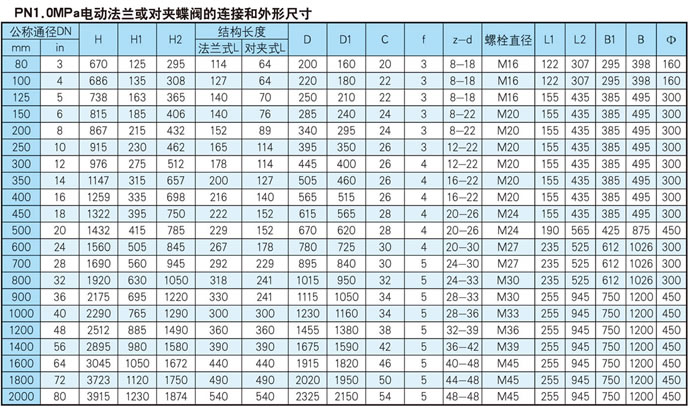 注:1、表中尺寸符合GB2555-8l、GB1 5.8-88、JB/T8527-97 2、 法蘭連接或?qū)A連接的結(jié)構(gòu)長(zhǎng)度按GB12221中的規(guī)定超過(guò)DNl000法蘭式采用對(duì)夾式的結(jié)構(gòu)長(zhǎng)度規(guī)定.也可根據(jù)用戶(hù)的需要協(xié)商決定. 3、PN2.5MPa、4 0MDa和表中H2尺寸可根據(jù)用戶(hù)需要制造。(長(zhǎng)桿蝶閥)